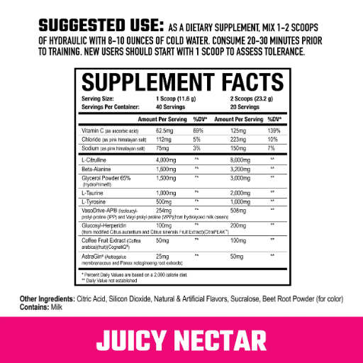 Hydraulic V2 has higher doses of L-Citrulline and Beta-Alanine, it also features several new trademarked ingredients including Vasodrive-AP®, Citrapeak®, Hydroprime®, Cognatiq®, AND Astragin®.