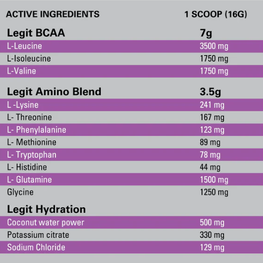 Legit Recovery is a complete recovery formula, featuring 9 essential amino acids and an electrolyte formula that ensures maximal hydration no matter how much you demand of your body. Legit Recovery has no added sugars or dyes making this blend the perfect choice for those who may already be in a deficit or those who are trying to avoid added colours!